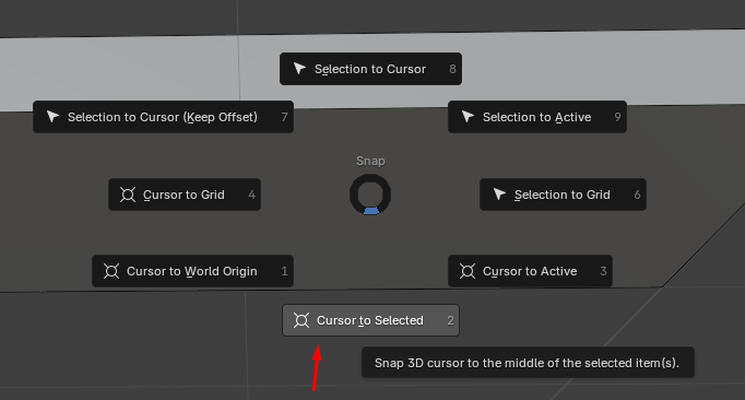 2. Snap the 3D cursor to that selection: press Shift + S and pick “Cursor to Selected“. The 3D Cursor will now jump to the exact spot.