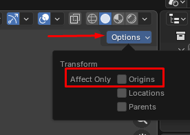 Blender also offers a direct way to move the origin. Simply by toggling a special mode. At the top of the 3D Viewport, there is an Options drop-down menu. You can find it in the header on the top-right corner.
